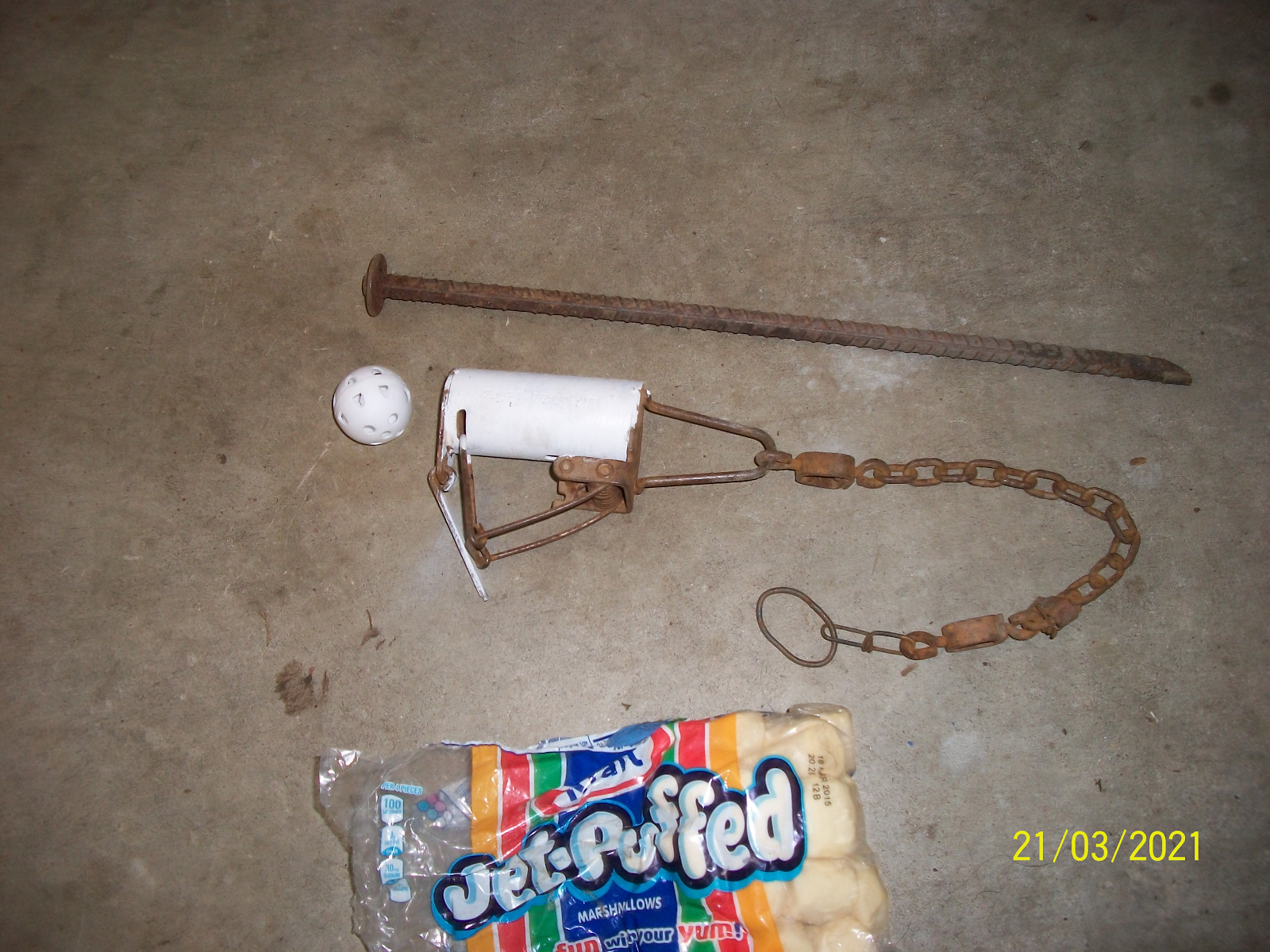 Recent developments in species specific traps let a trapper target raccoons, while excluding domestic dogs. These so-called “dog proof” traps are 100 % effective in excluding dogs. When set, the trap looks like a pipe sticking out of the ground. The raccoon reaches into the trap and grasps the trigger with its monkey-like fingers, and pulls the trigger upward, rather than pushing down. Using a sweet bait like marshmallow makes the trap even more selective in that domestic and feral cats are not attracted. Modifications: add a swivel near the end of the chain and cover the opening with a golf ball which prevents mice from getting the bait. Stake the trap